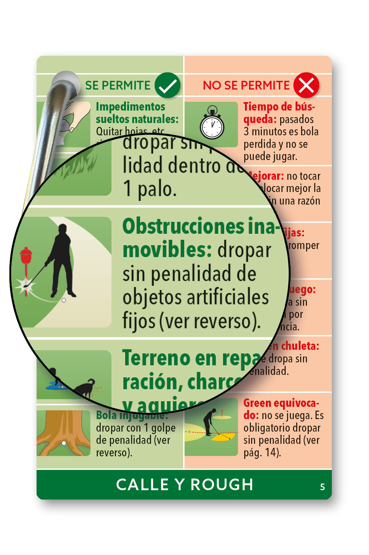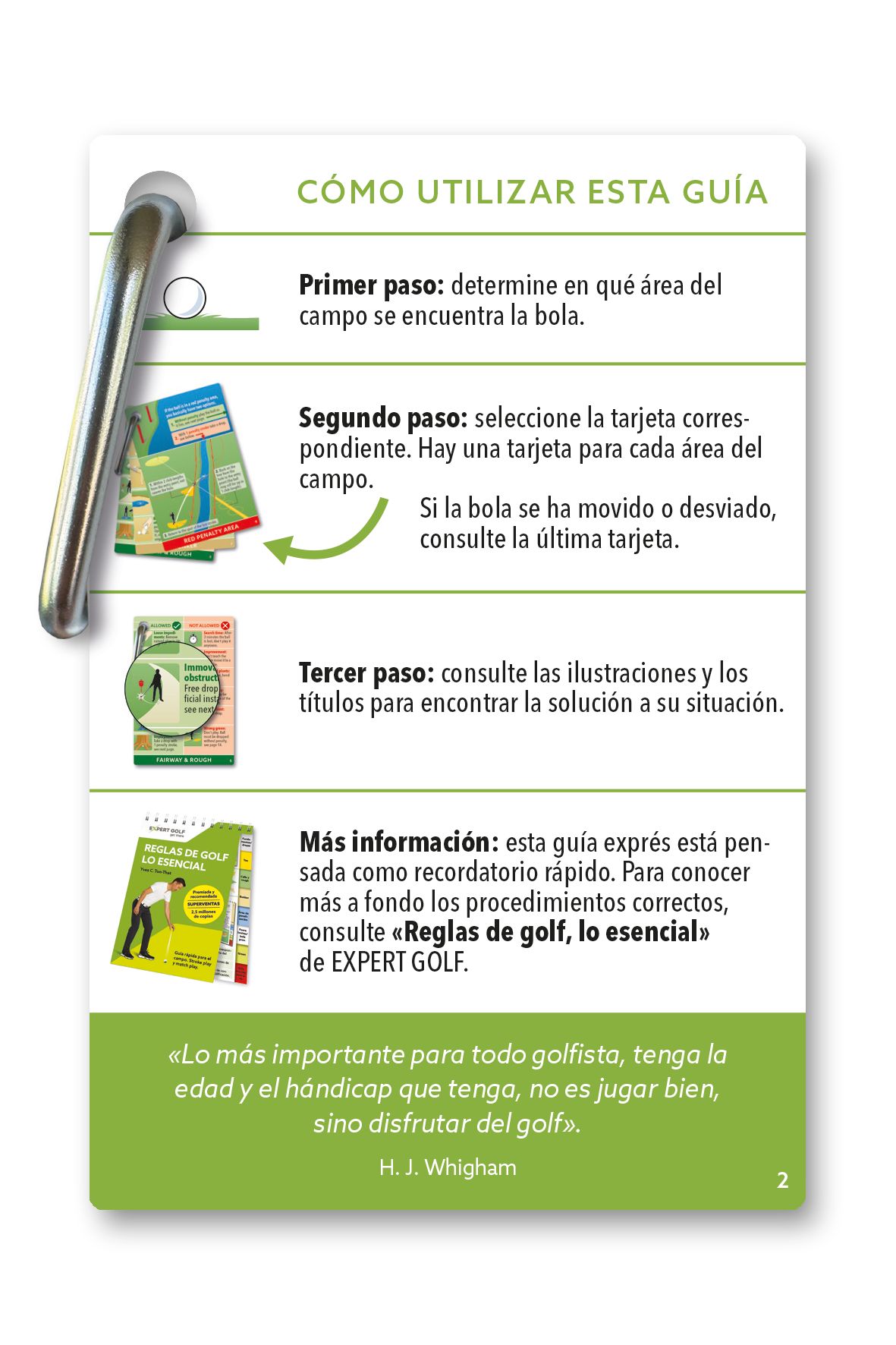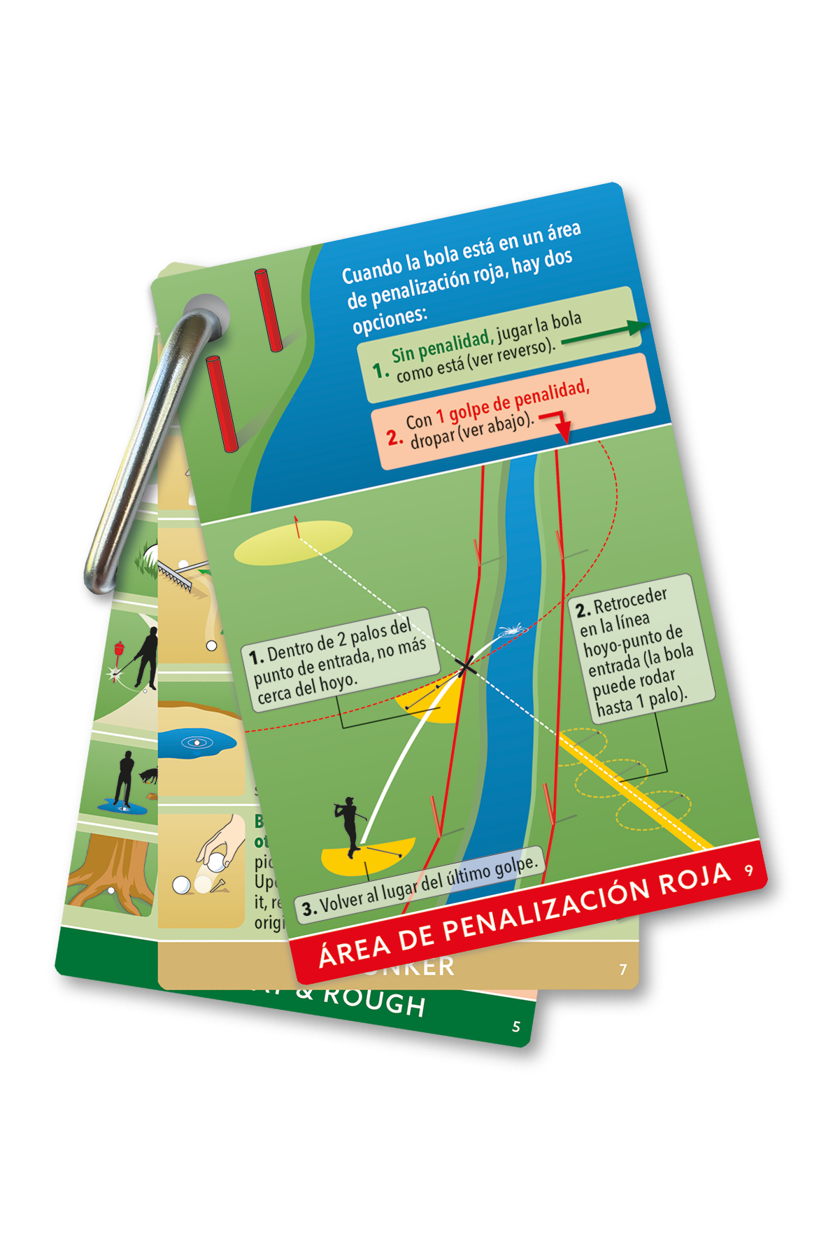 Las reglas siempre a mano en su bolsa de palos. “Reglas de golf EXPRÉS” ofrece respuestas a preguntas sobre las reglas de la forma más práctica: en formato para colgar de la bolsa. Todas las reglas importantes se resumen en nueve tarjetas impermeables y fáciles de entender. Cada parte del campo (salida, área de penalización, green, etc.) se trata en una sola tarjeta que muestra de forma sistemática lo que “se permite/no se permite”. Además, los procedimientos de dropar más comunes se explican con ilustraciones claras para que puede entenderlos de un vistazo, incluso bajo la presión del tiempo durante la partida. Las tarjetas se pueden fijar fácilmente a su bolsa de palos gracias a un mosquetón; así, la información sobre las reglas estará siempre a mano.