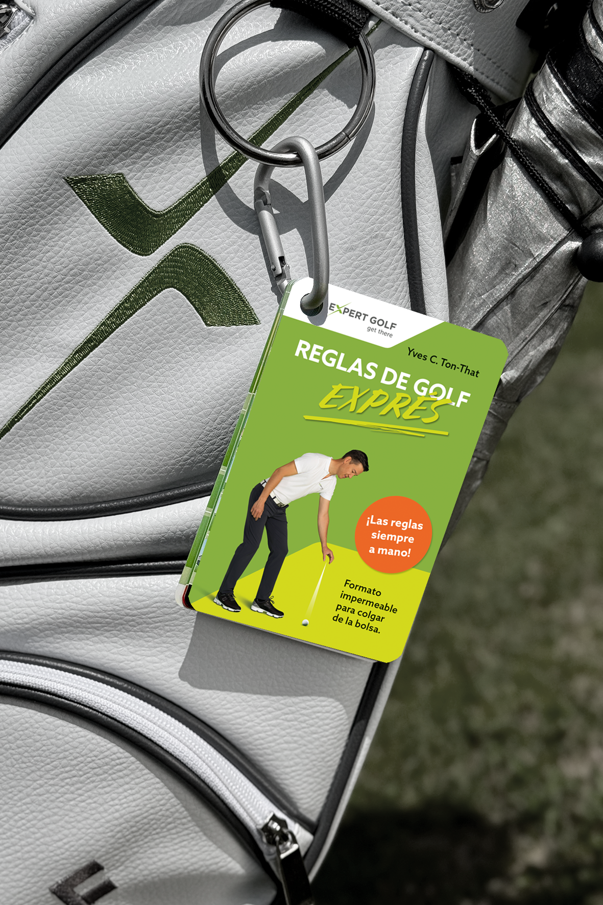 “Reglas de golf EXPRÉS – Formato impermeable para colgar de la bolsa”, de Yves C. Ton-That, 18 páginas, 108 ilustraciones, con enganche de mosquetón, 8 x 12 cm